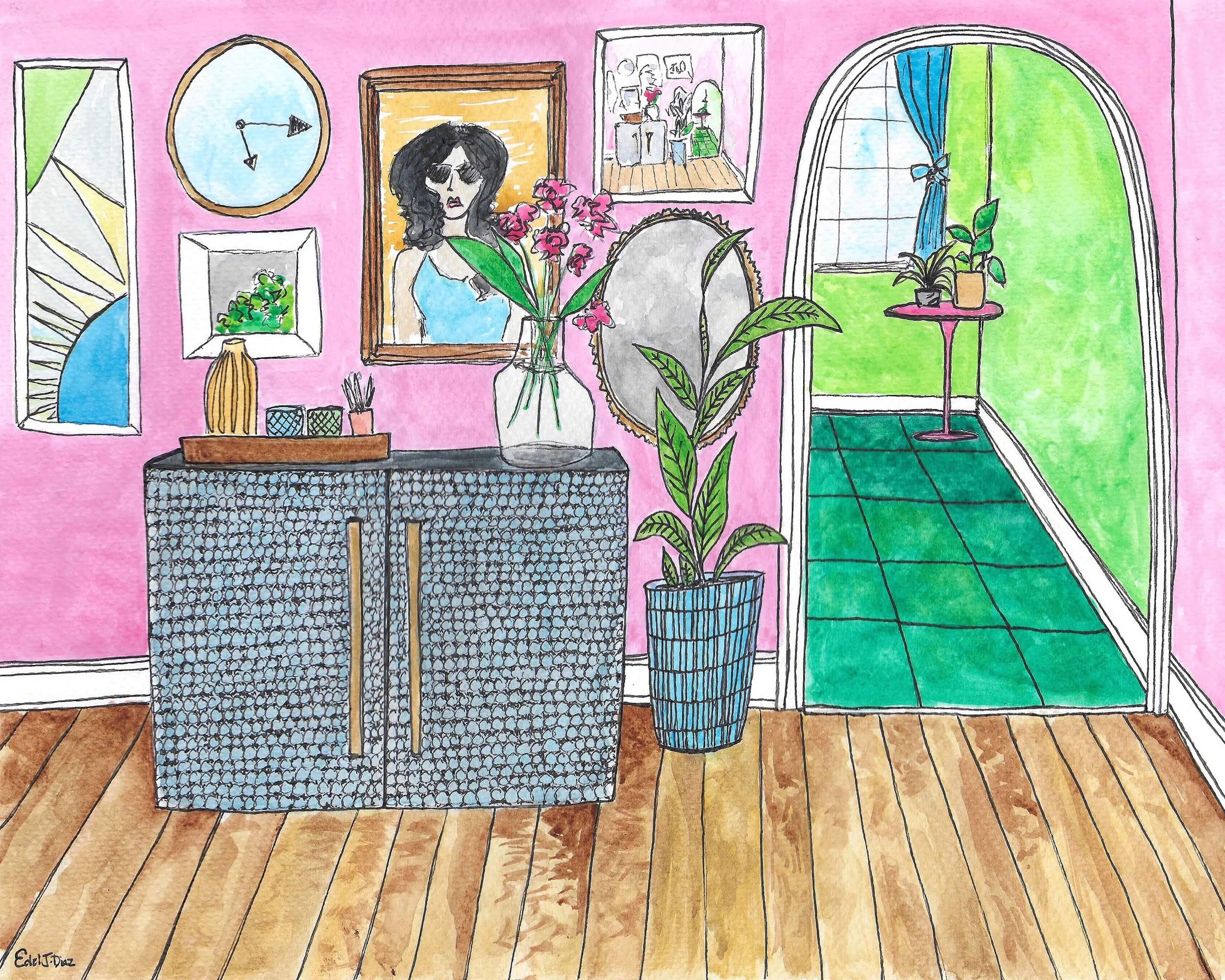 At the time I painted this, we were living in a sunny townhome with giant windows. The sunniest spot was the downstairs bay window, which I would load up with plants to soak in the sunshine. One day when watering the plants, I moved a plant onto the dining table in front of the bay window, and our polydactyl cat came up to sit next to the plant, occasionally nibbling on the leaves. She looked at me and I snapped a picture, just taking in that moment of her calm while observing this plant. I felt very inspired by that frozen moment in time and felt inspired to paint the scene. The only change I made when painting was the planter color. The plant was in a dark blue container, but I painted it in a vibrant cotton candy pink to match the cat’s bright pink nose.