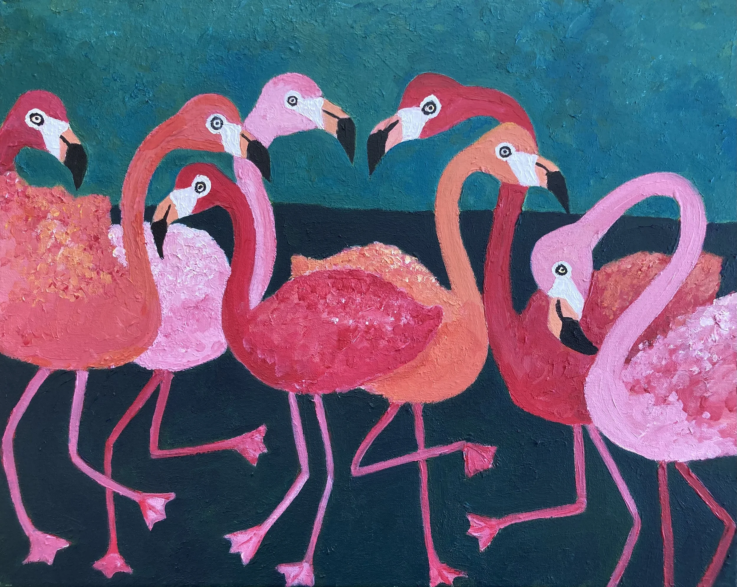 “Flamingo Party” (acrylic painting on canvas, 2021)