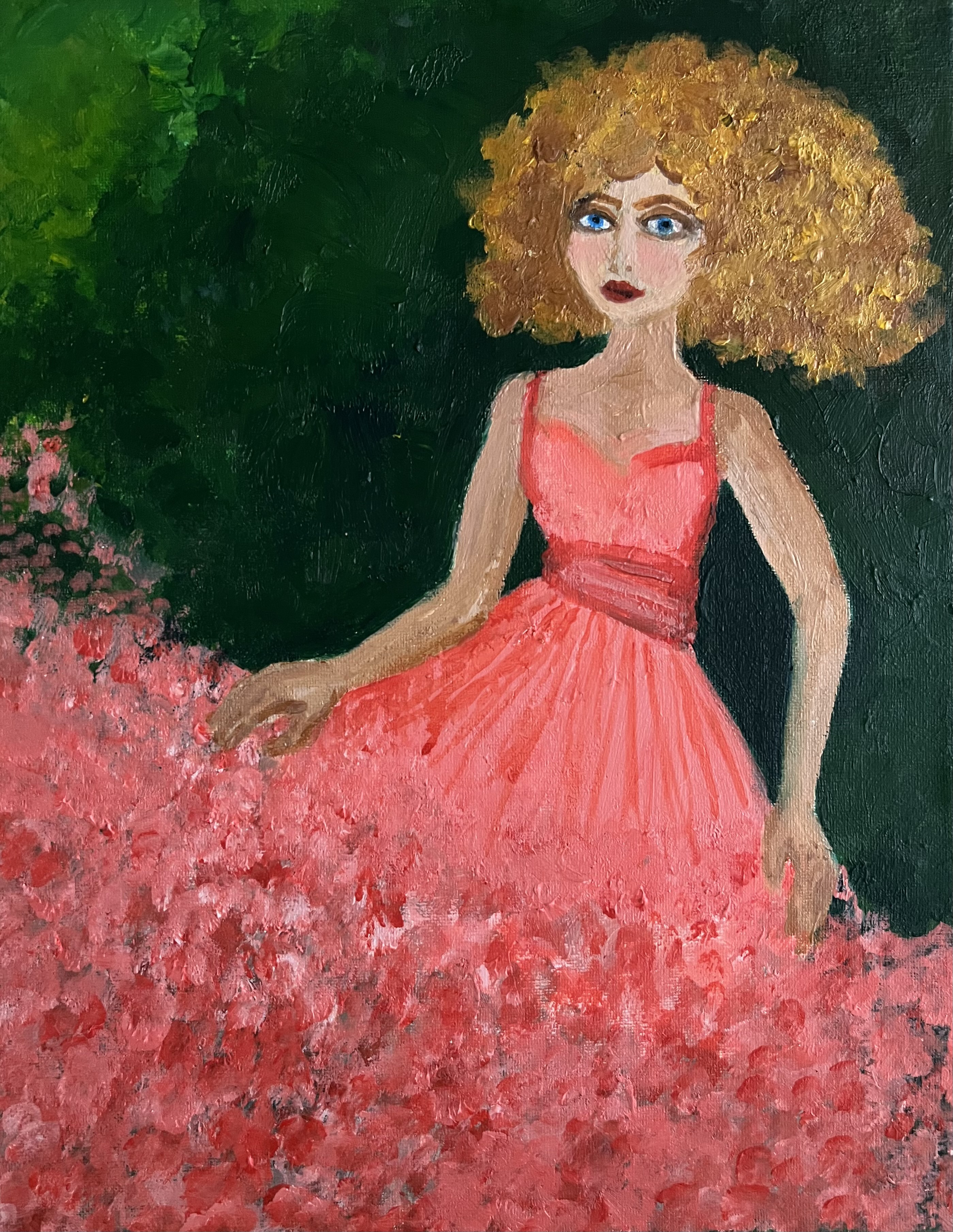 My wardrobe is predominantly black and grey, which some could consider chic, or just simple and lazy. In contrast to that I wanted to paint a woman in a colorful, fancy dress full of twirling motion. I love the way the dress almost floats off the page, and the intensity of the deep green background helps put the emphasis on this rather somber-looking woman with her volumunious blonde hair and fancy pink dress, caught twirling in motion.